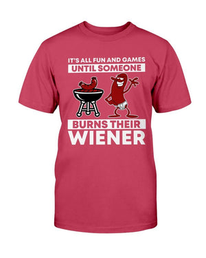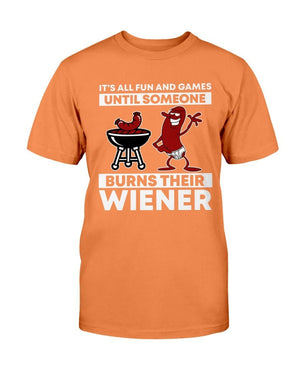 The perfect party shirt for your next barbecue! It's all fun and games until someone burns their wiener t-shirt is the perfect addition to our funny grilling shirts collection. As one of our finest gifts for men of all shapes, sizes, and backgrounds, your humorous loved one will absolutely love the hilariousness that ensues thanks to this beautiful BBQ t-shirt.